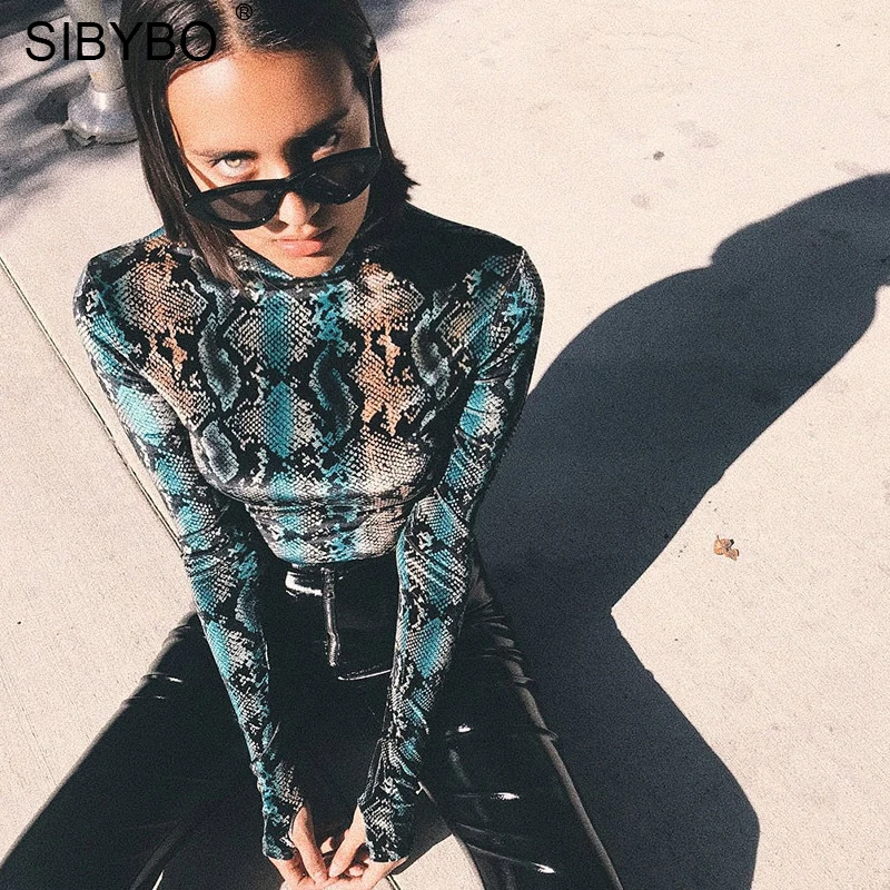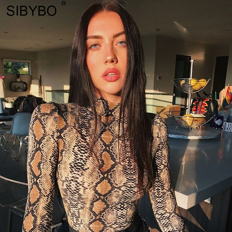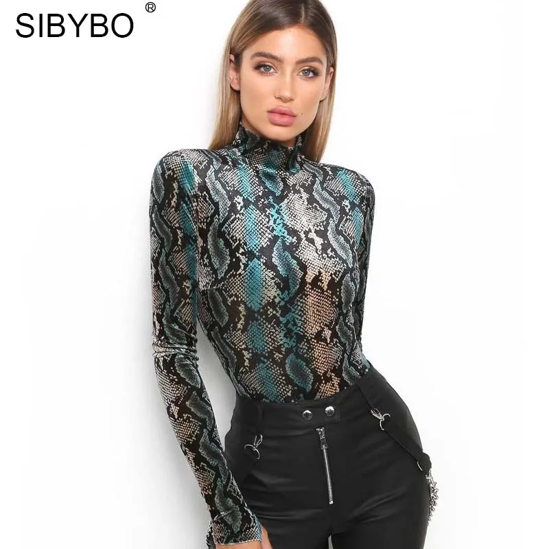 Special Offer SIBYBO ze skóry węża drukuj body kobiety bluzki z długim rękawem z golfem jesień zima Slim body pajacyki kobiet kombinezon Discount 36% Today!