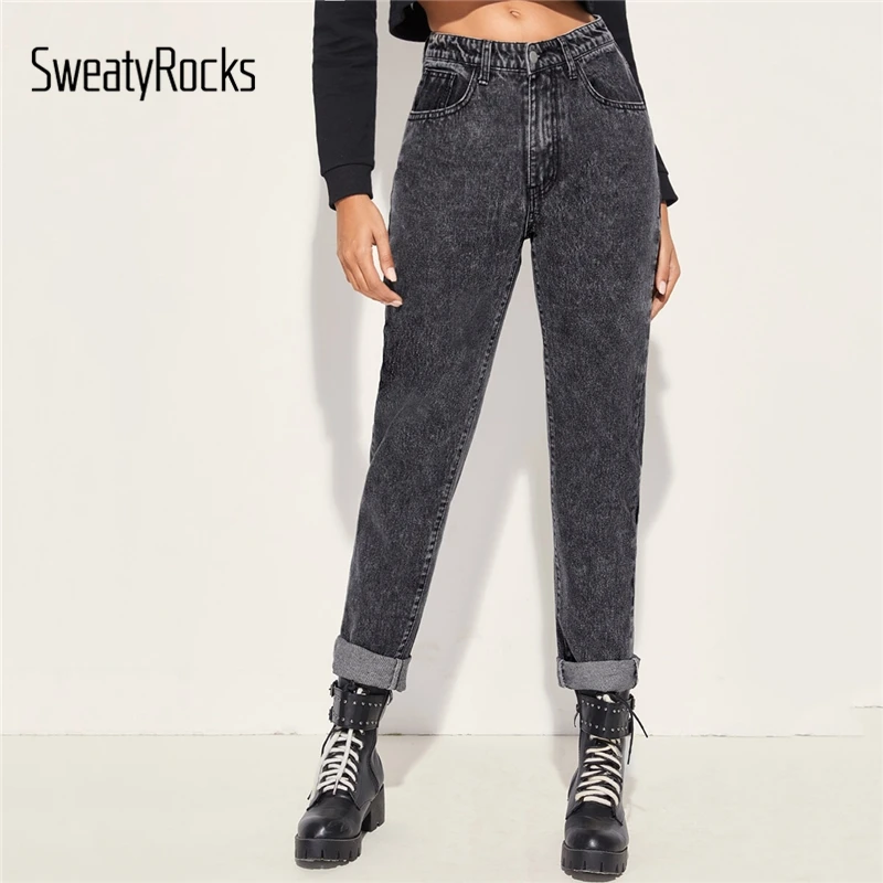 Special Offer SweatyRocks szary przycisk przodu dżinsy typu boyfriend 2019 jesień casualowe w stylu streetwear spodnie kobiety stałe stożkowe spodnie dżinsowe Discount 47% Today!