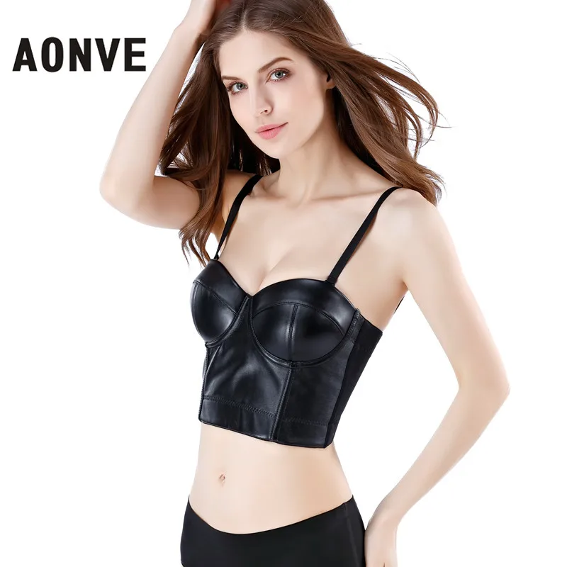 . (Zniżka 36%) Tanie AONVE kobiety Steampunk gorset topy biustonoszowe skórzane PU Bralette biustonosze push up dla kobiet gorset waist trainer bielizna wyszczuplająca krótki top Cena.