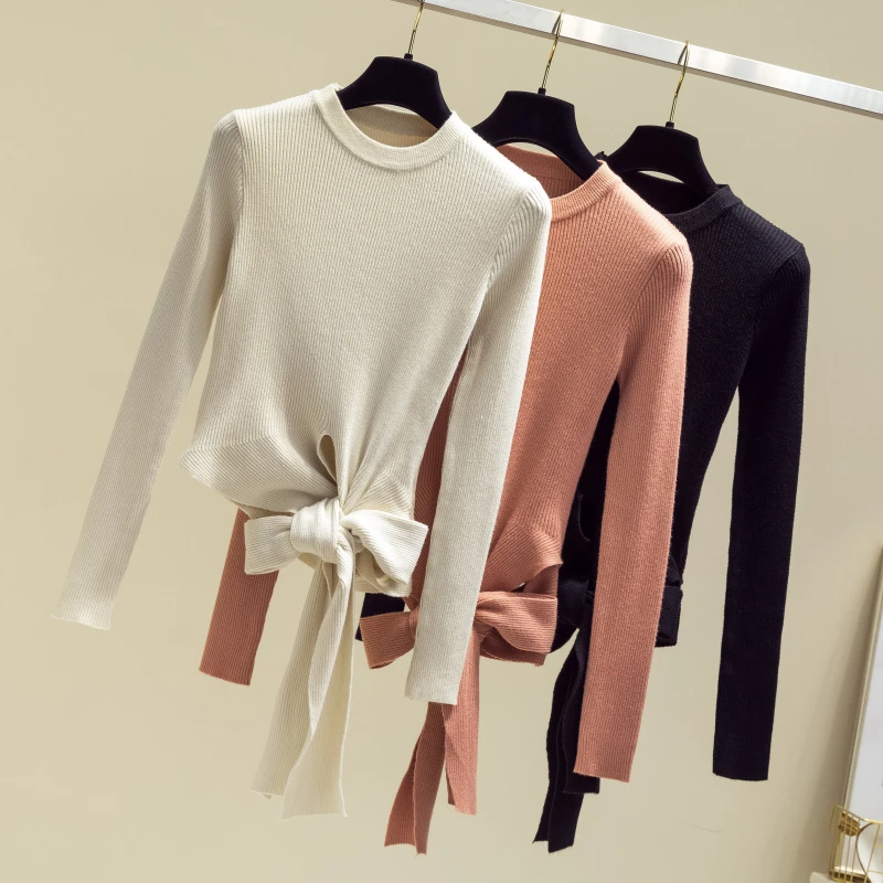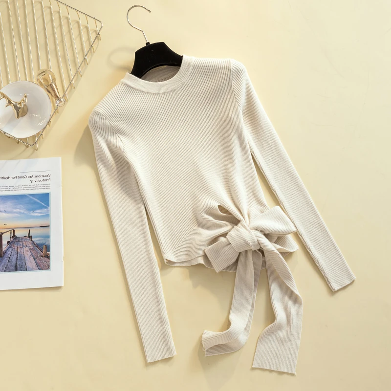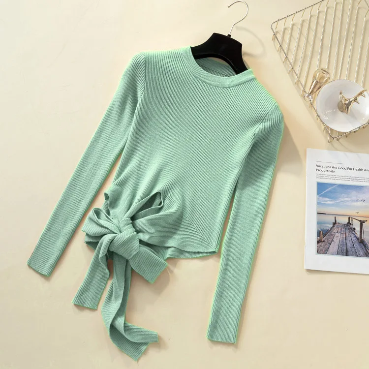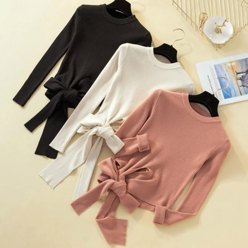 Special Offer 2019 kobiet jesienno zimowy sweter typu crop top pulower z okrągłym dekoltem zasznurować sweter z kokardami z długim rękawem solidne dziergany dół sweter Discount 40% Today!