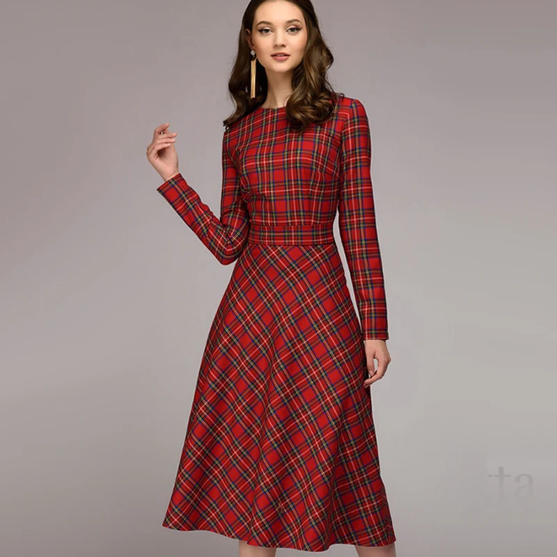 Special Offer Kobiety wstęgi w stylu vintage sukienka w czerwoną kratę panie z długim rękawem o szyi elegancka sukienka linii 2019 jesienno zimowa muszka sukienka Discount 42% Today!