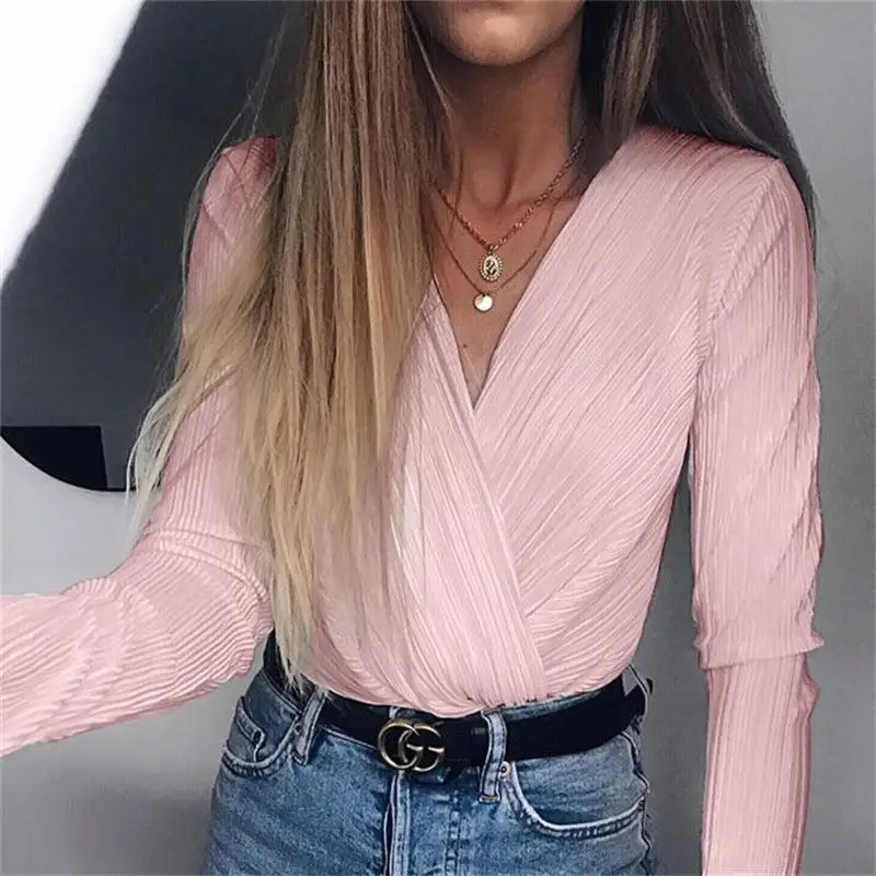 . (Zniżka 43%) Skup Tanie InstaHot Sexy z długim rękawem V body na szyję dla kobiet 2019 Summer New Fashion zielony teksturowany guzik do koszuli topy eleganckie przebrania Cena.