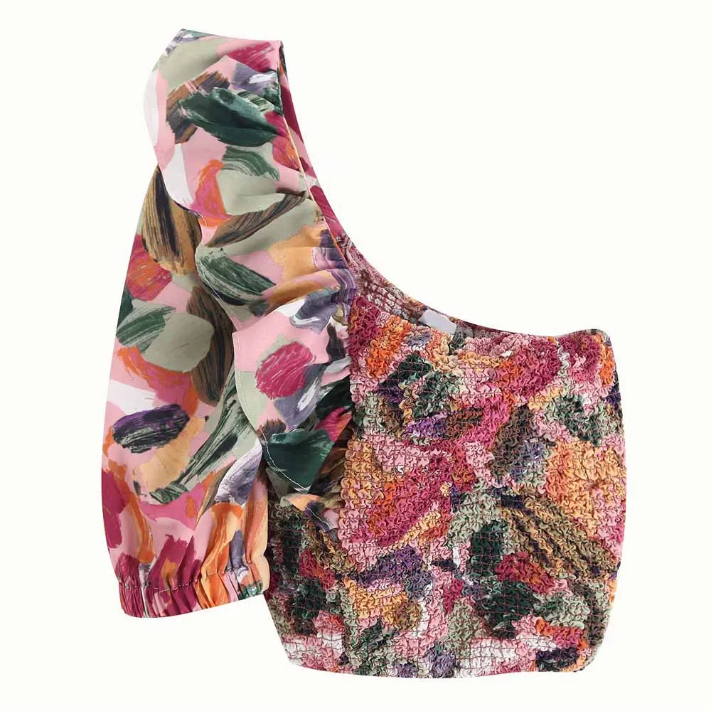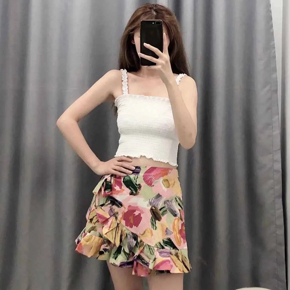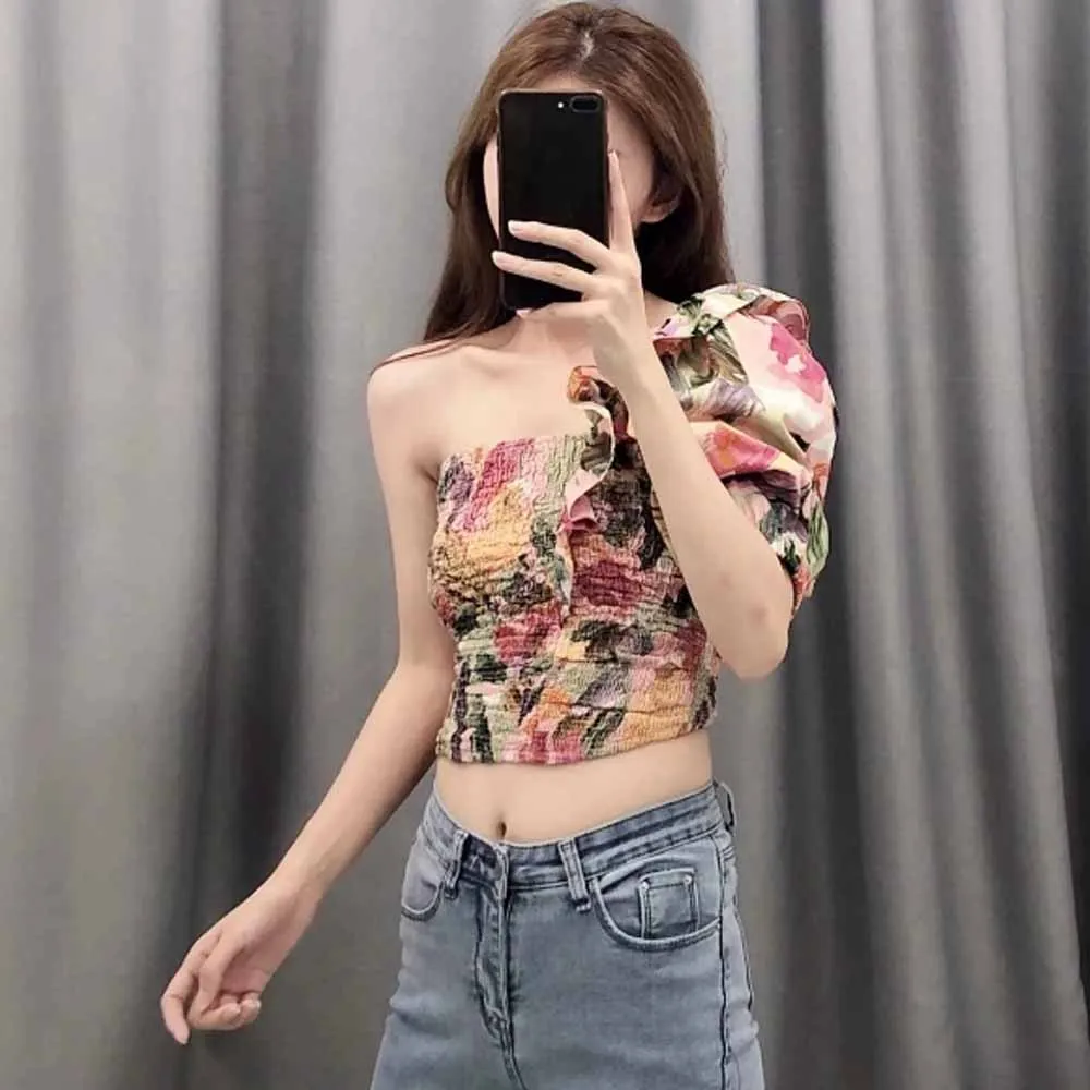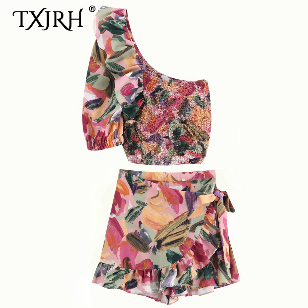 Special Offer TXJRH stylowy kolorowy kwiatowy nadruk elastyczna plisowana bluzka jeden rękaw Ruffles koszula Crop topy związane łuk krótki spódnica 2 sztuk zestawy Discount 28% Today!