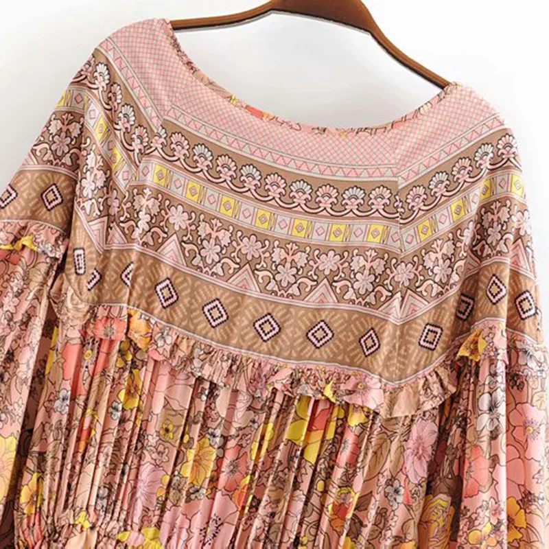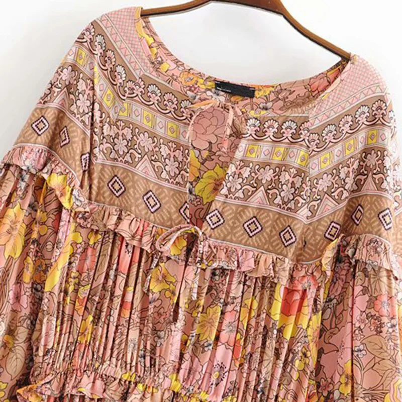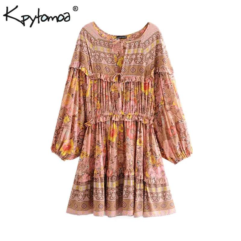 . (Zniżka 40%) Tanie Boho elegancka, letnia Vintage kwiatowy nadruk marszczenia Mini sukienka kobiety 2019 moda z długim rękawem muszka sukienki plażowe Femme Vestidos Ceny.