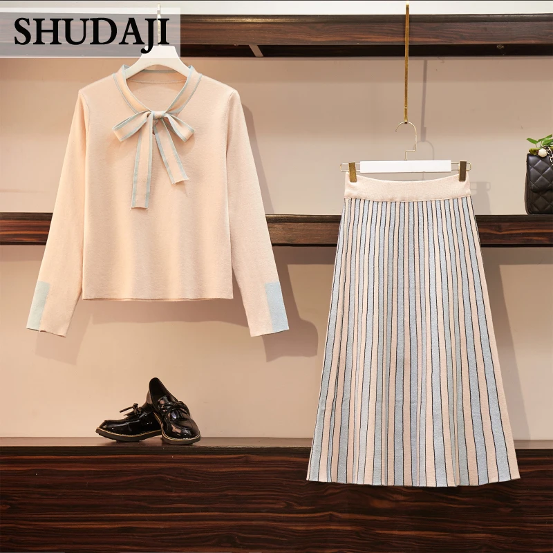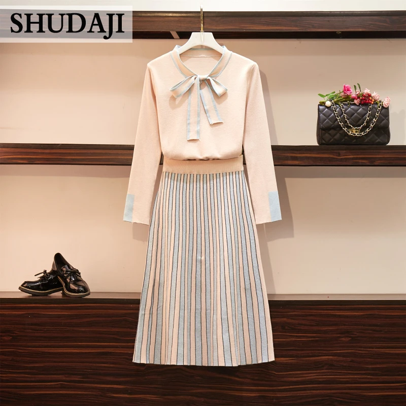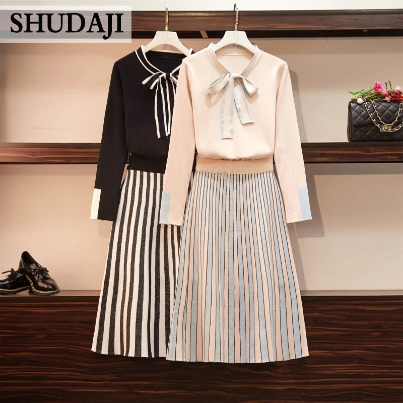 . (Zniżka 50%) Skup Duży rozmiar damska sukienka jesień zima z długim rękawem łuk krawat w paski sukienka z dzianiny sweter garnitur spódnica dwuczęściowy garnitur drress Najtaniej Cena.