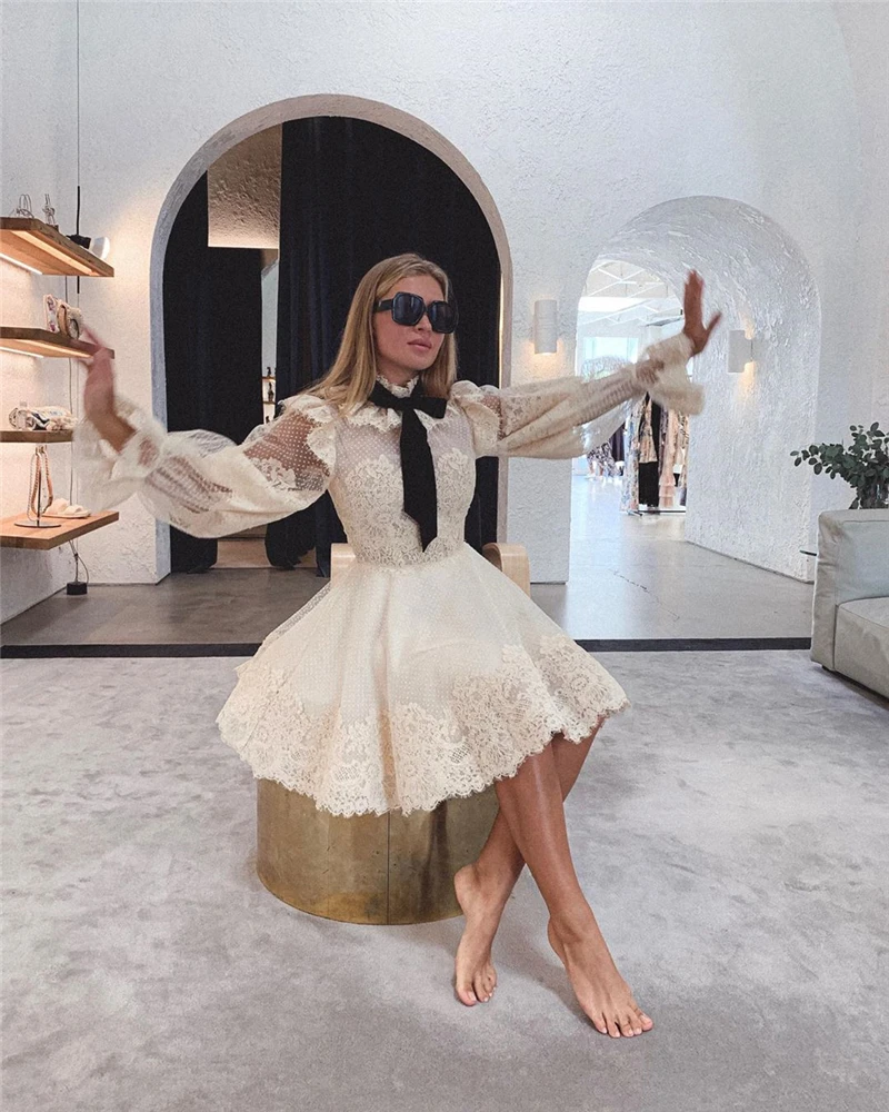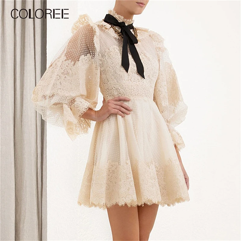 Special Offer COLOREE designerska bluzka 2019 kobiety beżowa sukienka urocza koronka siatkowy patchwork szyfonowa Mini sukienka elegancka, długa z długim rękawem damska sukienka Discount 23% Today!