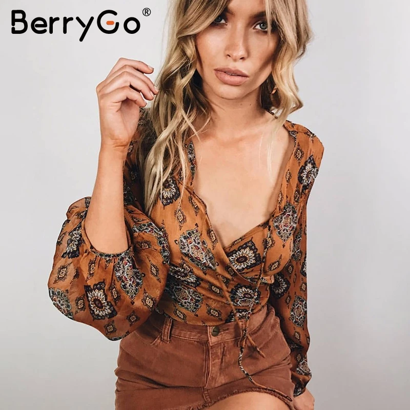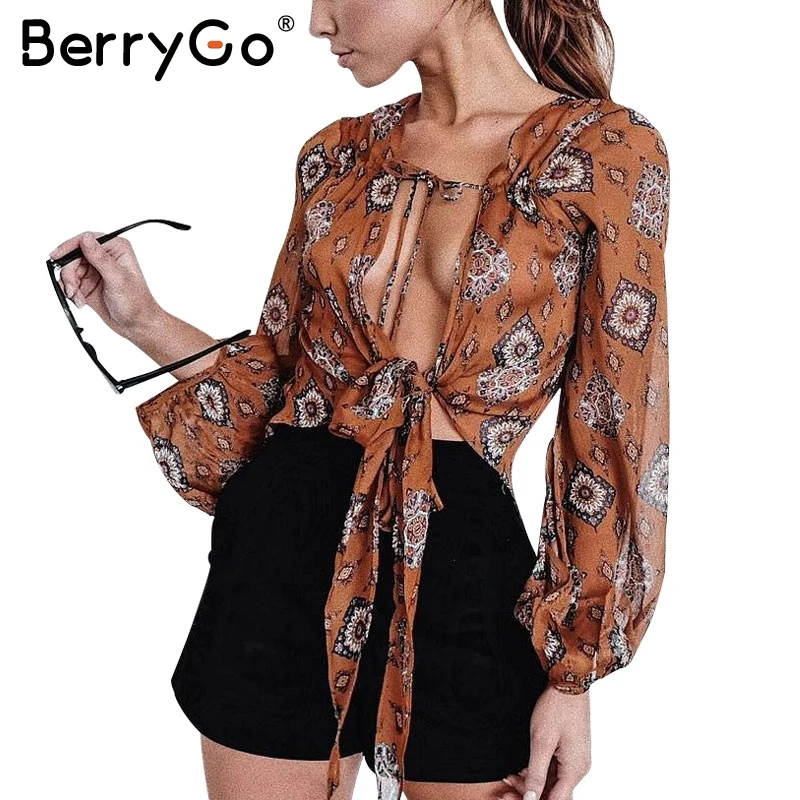 Special Offer BerryGo Print v neck szyfonowa bluzka koszula kobiety lato z długim rękawem crop bluzka 2019 seksowna sukienka łuk bluzka damska blusas Discount 40% Today!