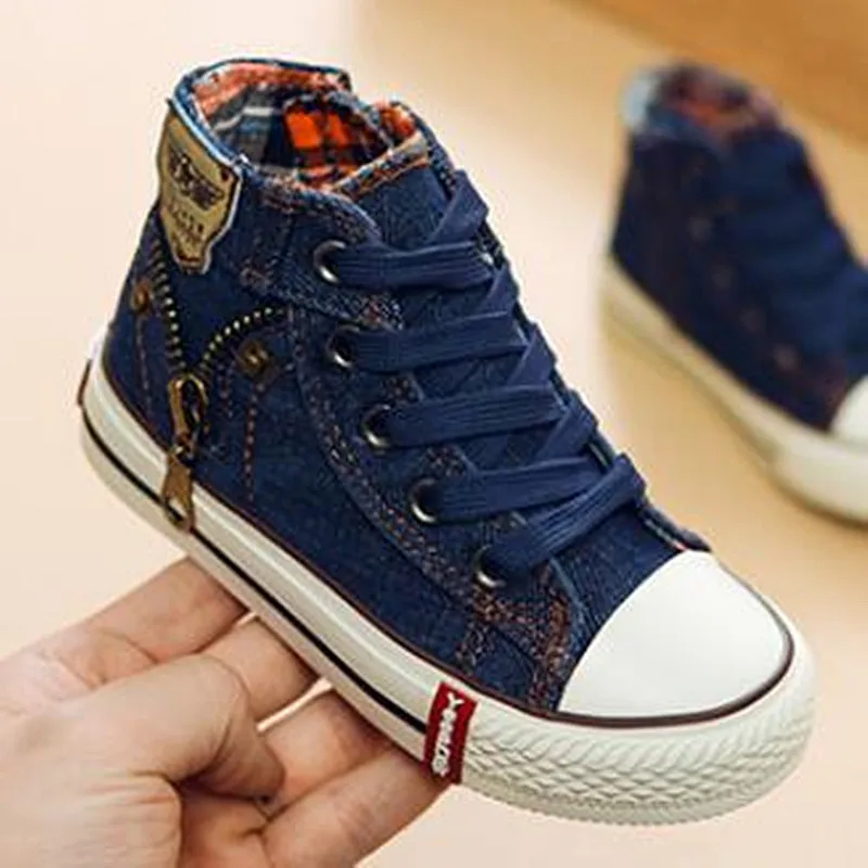 . (Zniżka 40%) Tanie Wiosna jesień moda wysoka pomoc brezentowych butów dzieci mieszkania oddychające dorywczo Denim boczny zamek błyskawiczny chłopcy dziewczęta Sneakers 04 Ceny.
