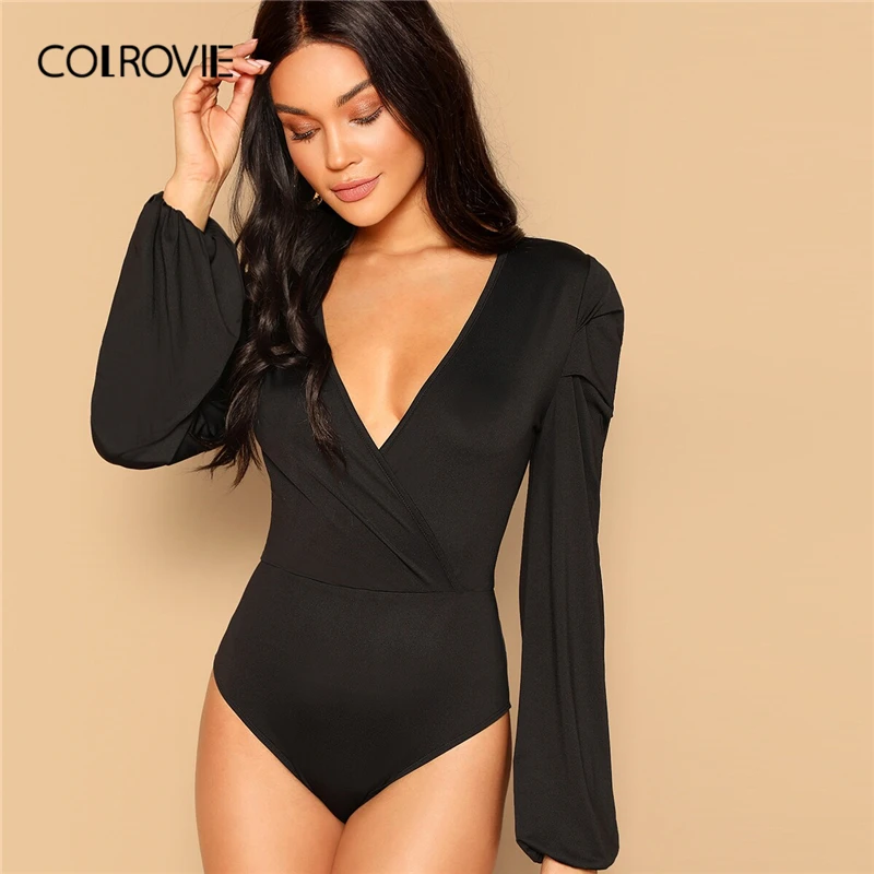 Special Offer COLROVIE czarny kombinezon szyi blisko dopasowane body kobiety rękaw w stylu bishop obcisłe body 2019 lato Streetwear Sexy body Discount 51% Today!