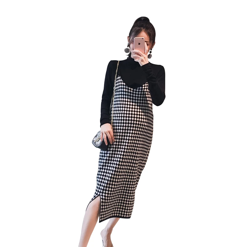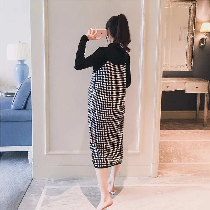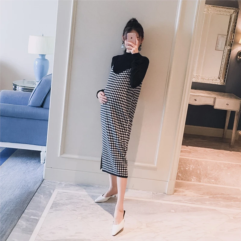 Special Offer 5060 #2 sztuk zestaw czarny dzianiny macierzyński zwężane koszule + Sling sukienka w kratę jesień koreański moda dla kobiet w ciąży ciąża Discount 8% Today!