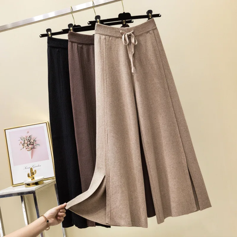 . (Zniżka 40%) Skup Kobiety 2019 luźne czyste dorywczo miękkie spodnie jesień zima dzianiny kaszmirowy sweter szerokie spodnie nogi w pasie muszka rozdzielone spodnie Najtaniej Ceny.