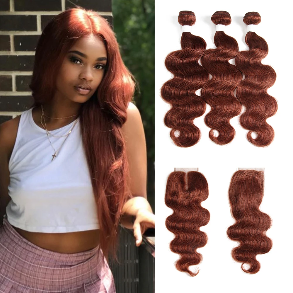 Special Offer Brązowy Auburn wiązki ludzkich włosów z zamknięcia 4x4 KEMY włosy 3 sztuk brazylijski ciało fala ludzkie włosy splot wiązki nie Remy włosy Discount 49% Today!