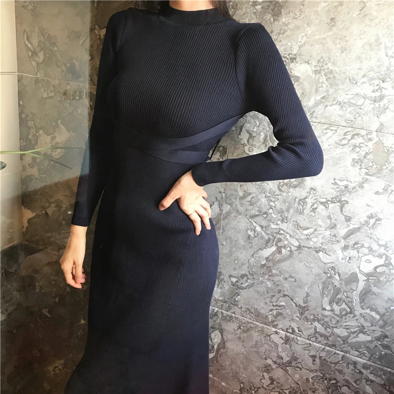 . (Zniżka 50%) Skup Tanie Neophil 2019 kobiet zima dzianiny linii sukienki midi O Neck Bow Sashes z długim rękawem Slim Vintage panie eleganckie sukienki D2910 Cena.