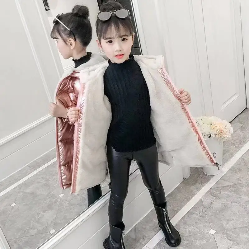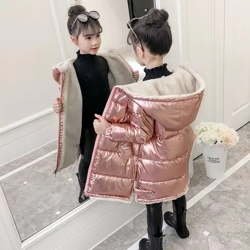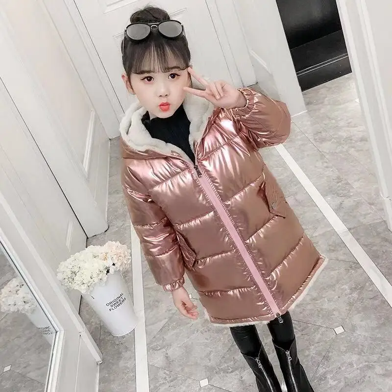 Special Offer Różowa tkanina złocona błyszcząca długa kurtka zimowa dla dziewczynek z kapturem ciepła błyszcząca dół bawełna chłopcy odzież wierzchnia parki dziecięce płaszcze Discount 25% Today!