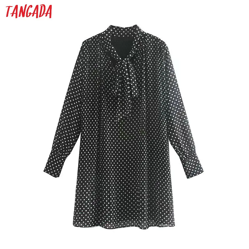 Special Offer Tangada kobiety polka dot luźna mini sukienka z długim rękawem vintage lady sukienka kobieca kokarda sukienka z szarfą vestidos 4M43 Discount 30% Today!