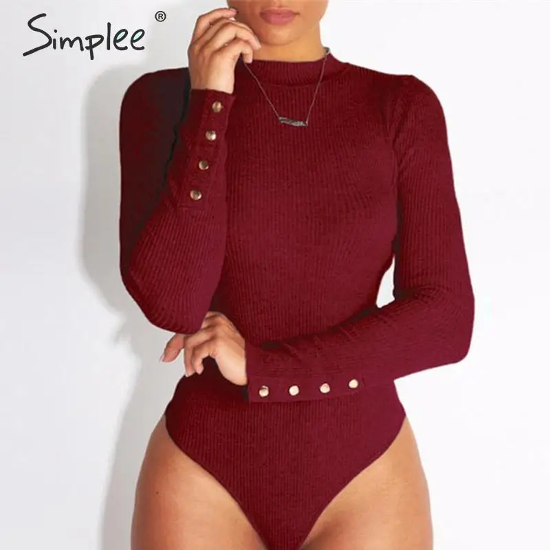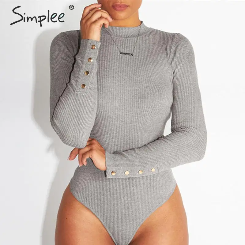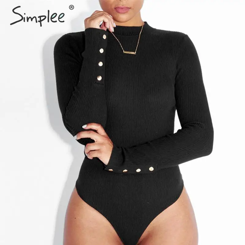 Special Offer Simplee eleganckie body z dzianiny damskie Casual długi guzik na rękawie kombinezon damski romper jesienne zimowe szczupłe damskie kombinezony 2019 Discount 45% Today!