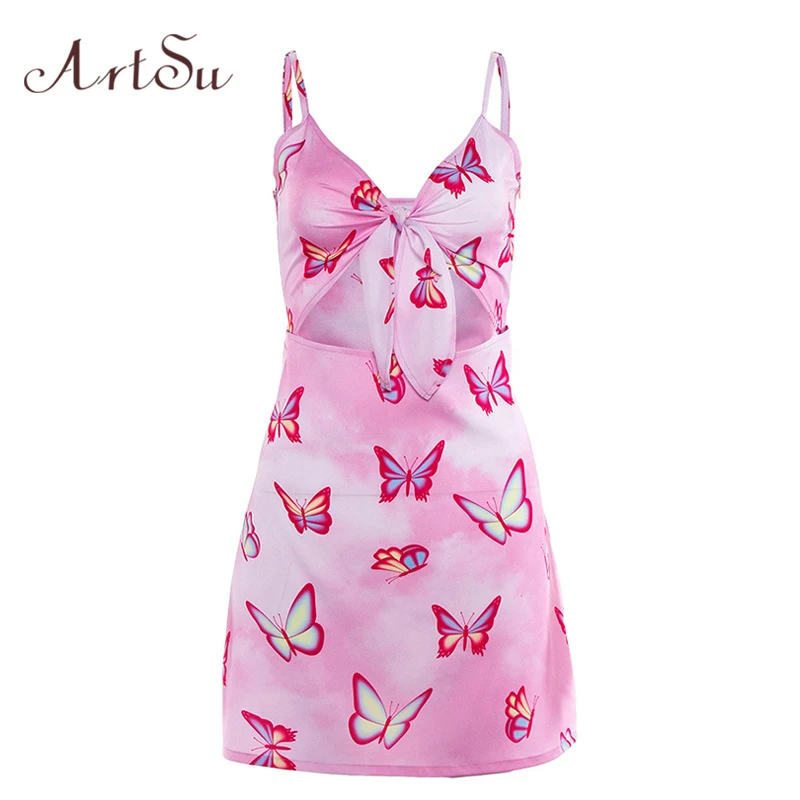 Special Offer ArtSu różowy nadruk z motylem seksowna śliczna letnia sukienka 2019 V dekolt kokarda Spaghetti pasek Backless mini sukienka letnia Boho ASDR21965 Discount 49% Today!