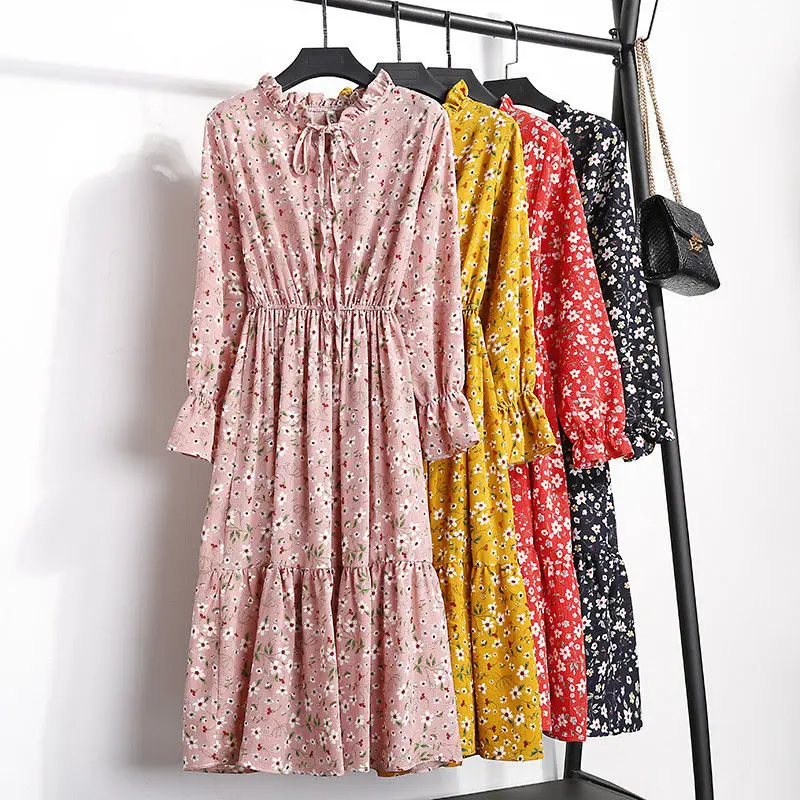 Special Offer Letni nadruk kwiaty kobiety Kawaii sukienka koreańskie casual długi rękaw połowy łydki sukienka Vintage Vestidos urocze ubranka Discount 52% Today!