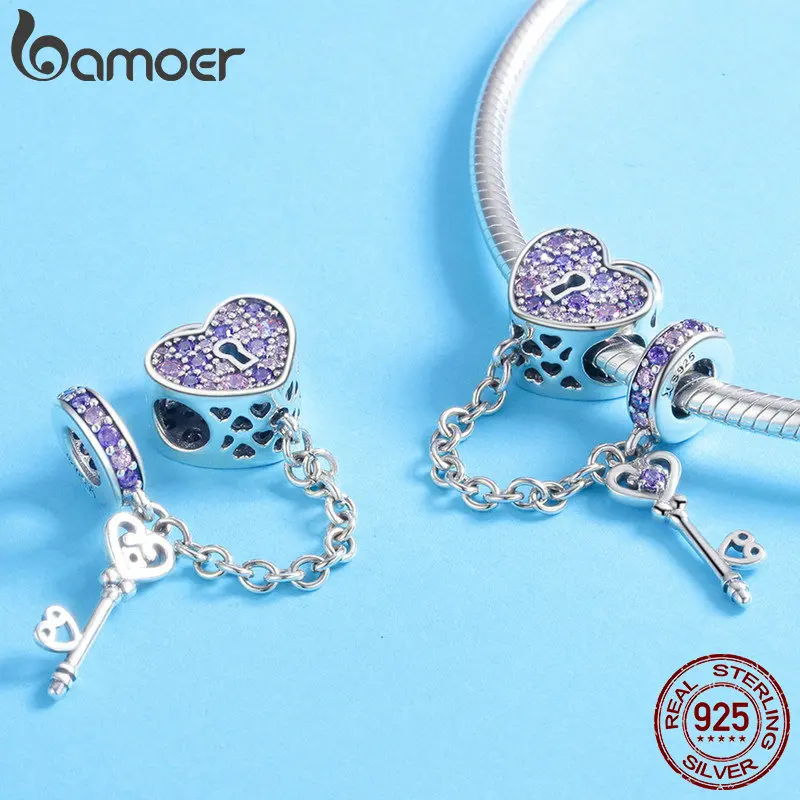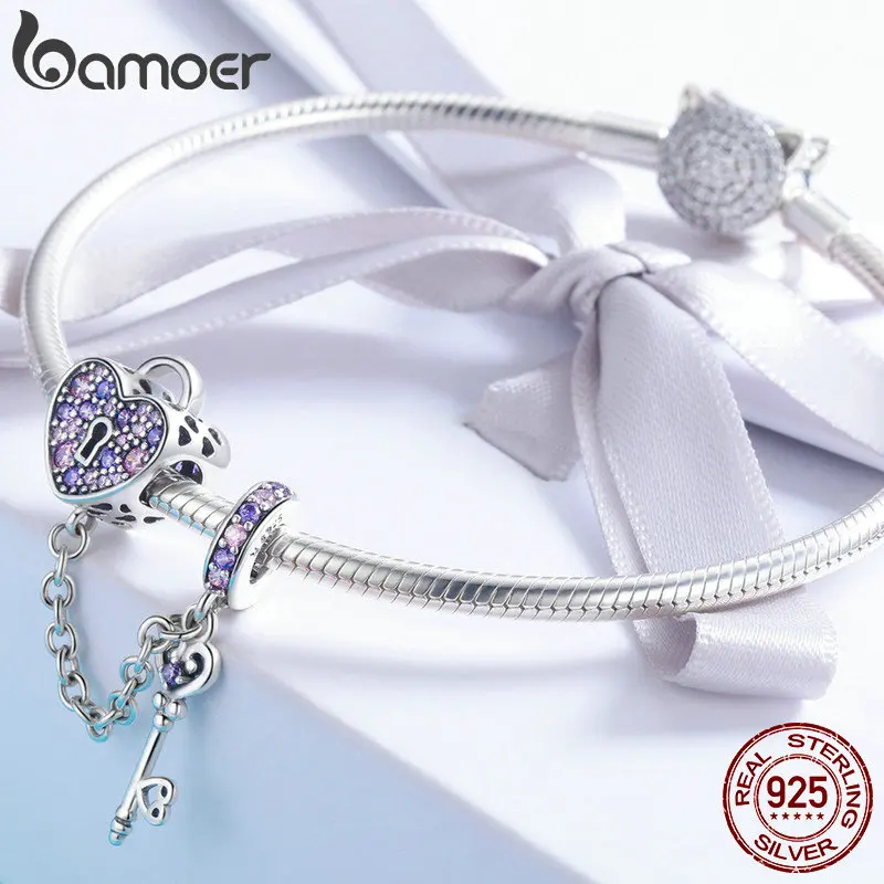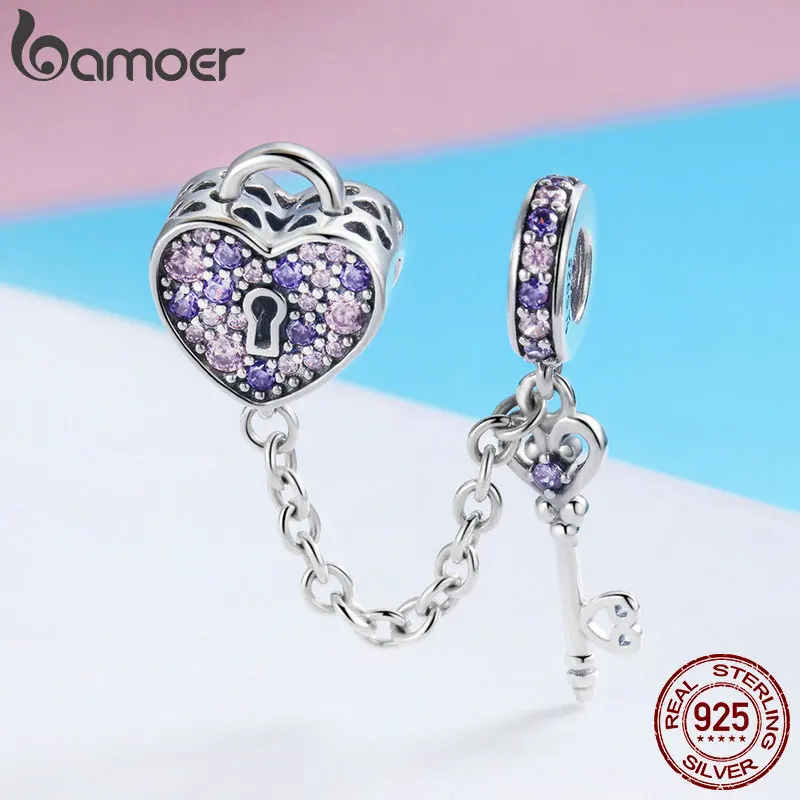 . (Zniżka 30%) Tanie BAMOER 100% 925 srebrny klucz serca blokada kryształ CZ łańcuch Charms dopasowane bransoletki z charmsami i naszyjniki łańcuch biżuteria SCC772 Ceny.