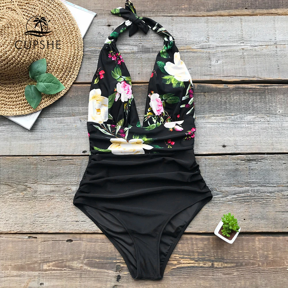 . (Zniżka 50%) Skup Tanie CUPSHE z nadrukiem kwiatowym motyl marszczący jednoczęściowy strój kąpielowy kobiety Halter głęboki dekolt bez pleców seksowne body Monokinis stroje kąpielowe Cena.