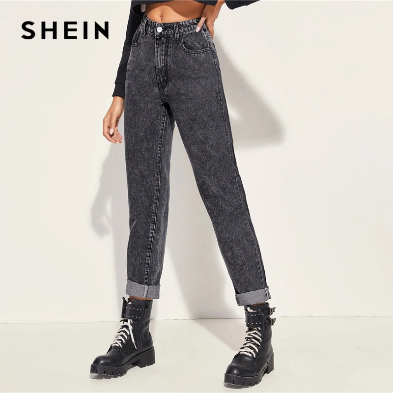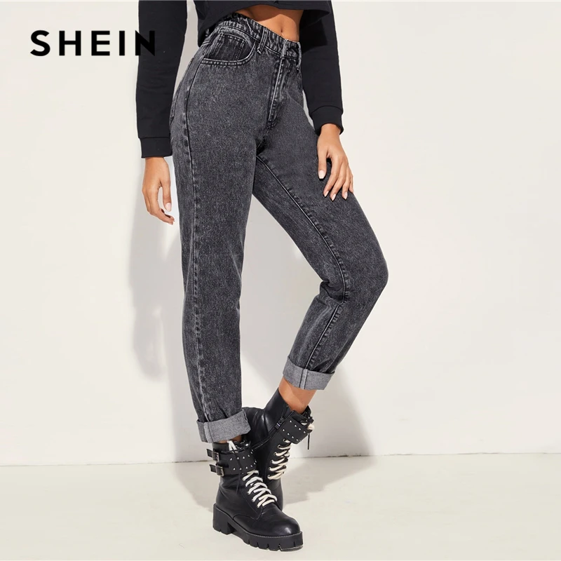 . (Zniżka 51%) Tanie SHEIN szary przycisk z przodu chłopaka dżinsy kobiet spodnie i spódnice 2019 jesień Streetwear w połowie talii moda długie spodnie jeansowe Ceny.