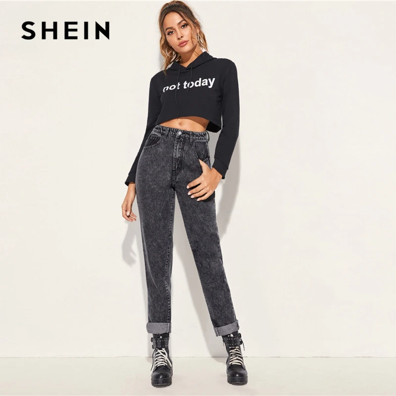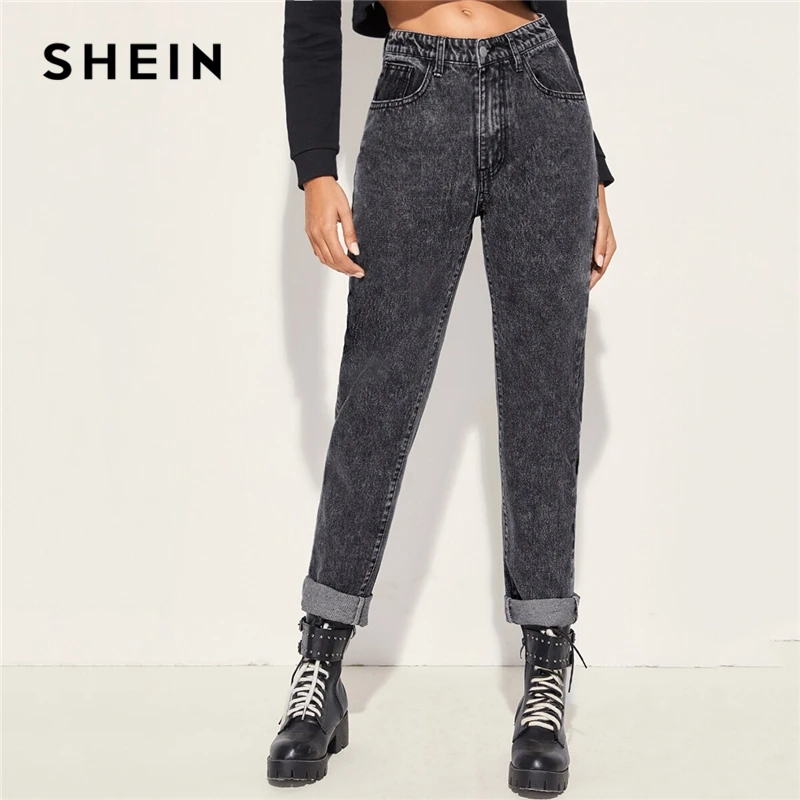 Special Offer SHEIN szary przycisk z przodu chłopaka dżinsy kobiet spodnie i spódnice 2019 jesień Streetwear w połowie talii moda długie spodnie jeansowe Discount 51% Today!