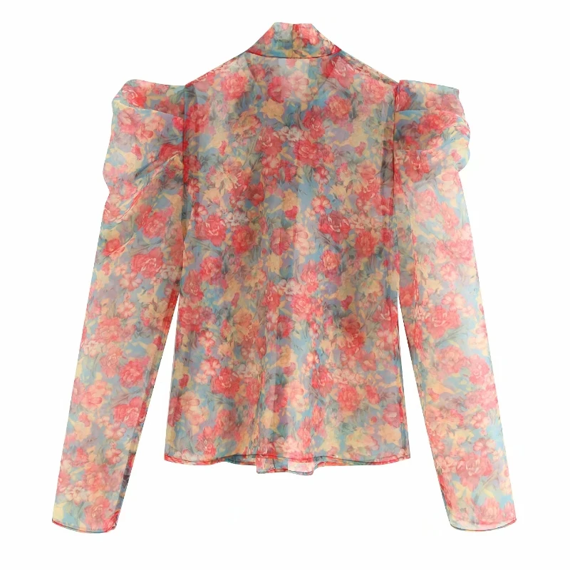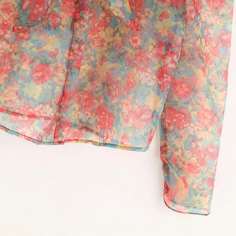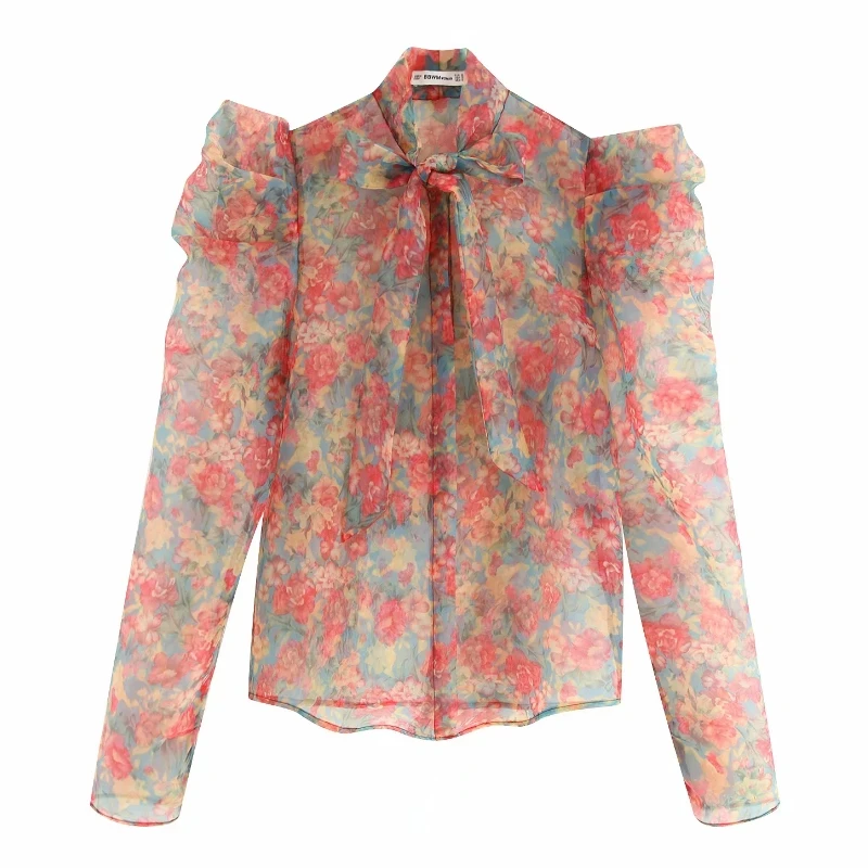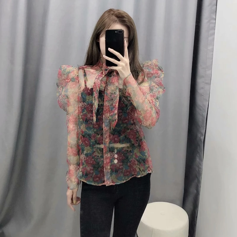 Special Offer Kobiety słodkie czerwony kwiat drukowanie na co dzień organza bluzki koszula kobiety z długim rękawem łuk wiązane bluza blusas przezroczysta koszulka LS3960 Discount 27% Today!
