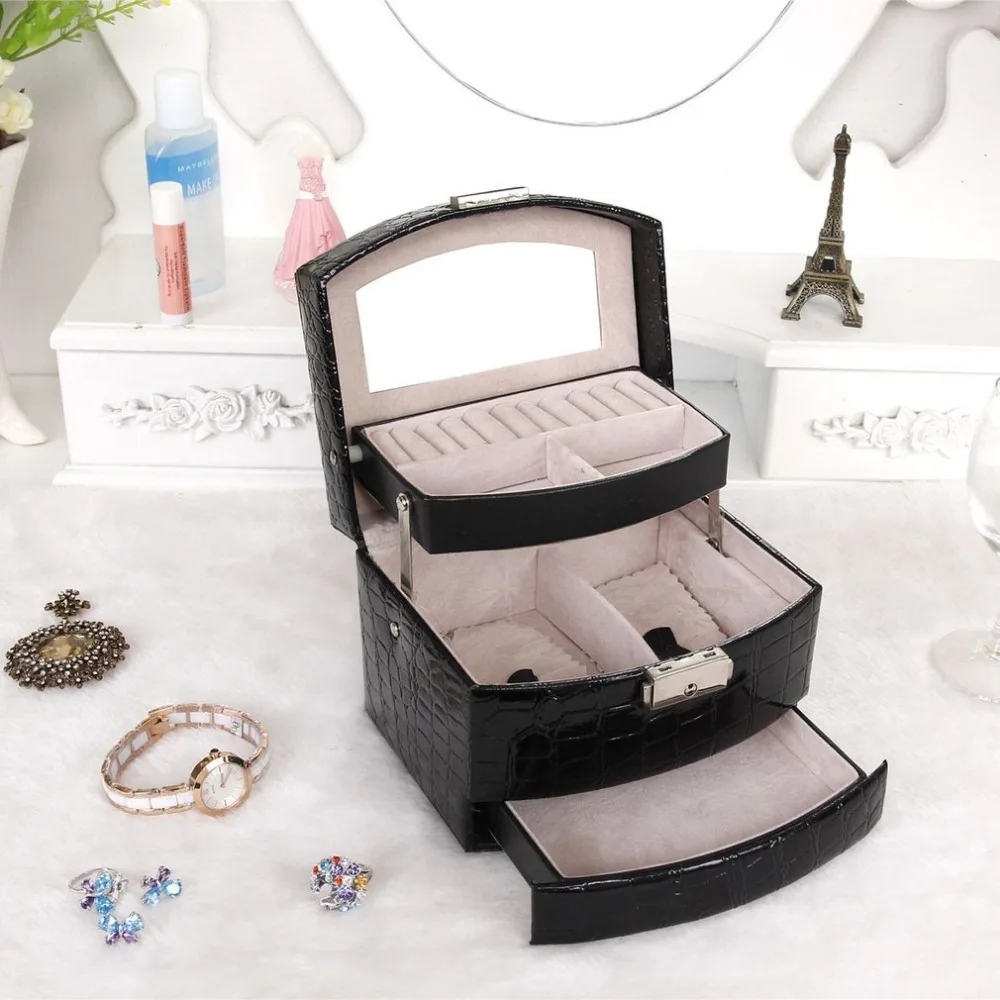 Special Offer Wysokiej jakości wyświetlacz biżuterii krokodyla skórzane pudełko 3 warstwy pierścień naszyjnik łańcuch biżuteria Case pojemnik przechowywanie w domu dostaw Discount 30% Today!