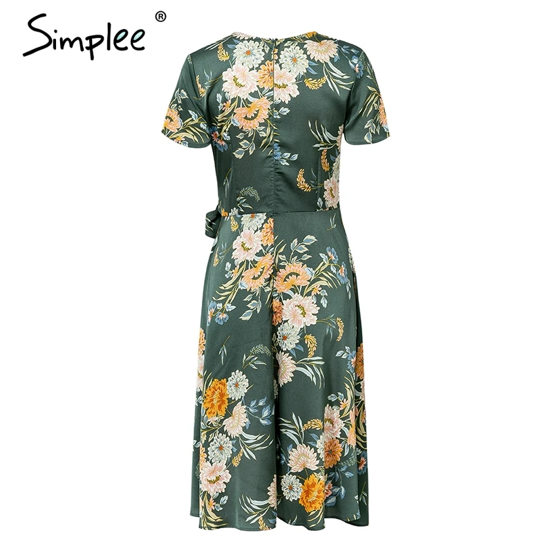 Special Offer Simplee elegancki kwiatowy print satynowe kobiety sukienka Wrap v wysoki dekolt w talii letnie sukienki seksowna kokardka krawat zielony casual kobieta vestidos Discount 49% Today!