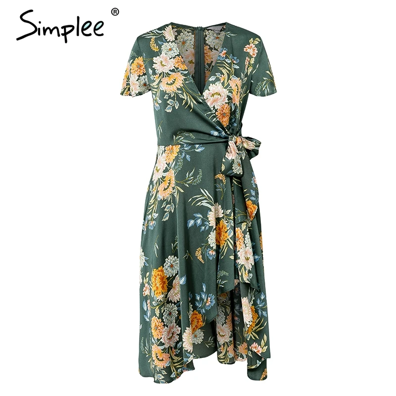. (Zniżka 49%) Tanie Simplee elegancki kwiatowy print satynowe kobiety sukienka Wrap v wysoki dekolt w talii letnie sukienki seksowna kokardka krawat zielony casual kobieta vestidos Ceny.