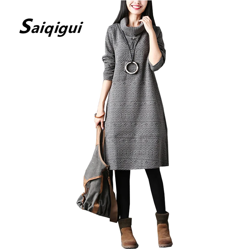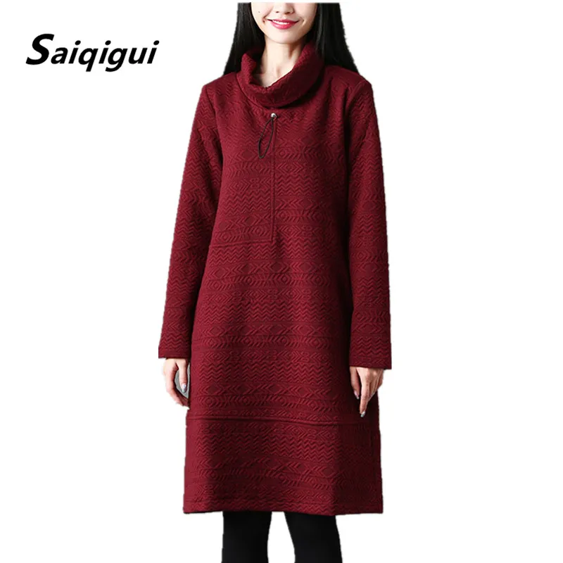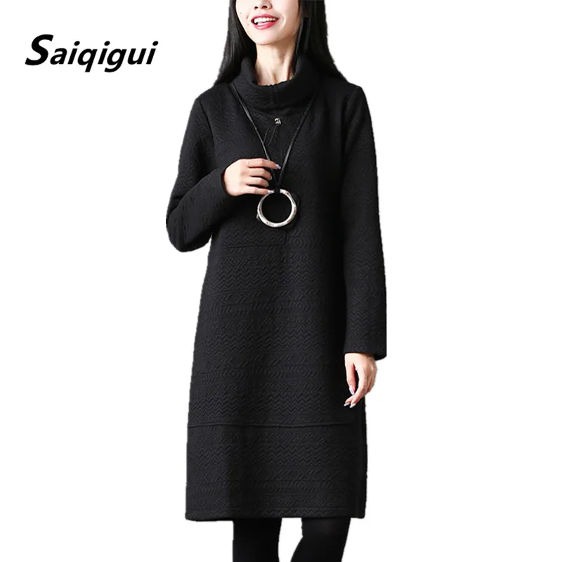 Special Offer Saiqigui jesienno zimowa sukienka damska z długim rękawem casual luźna solidna bawełniany spód sukienka z golfem A Line vestidos de festa Discount 20% Today!