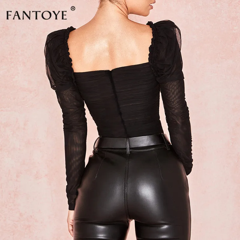 Special Offer Fantoye Sexy czarne koronkowe niski kołnierz body kobiety Mesh warstwowe Backless Ruffles wąska obcisła topy Femme eleganckie Vintage kombinezony Discount 40% Today!