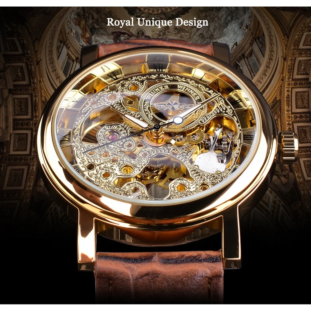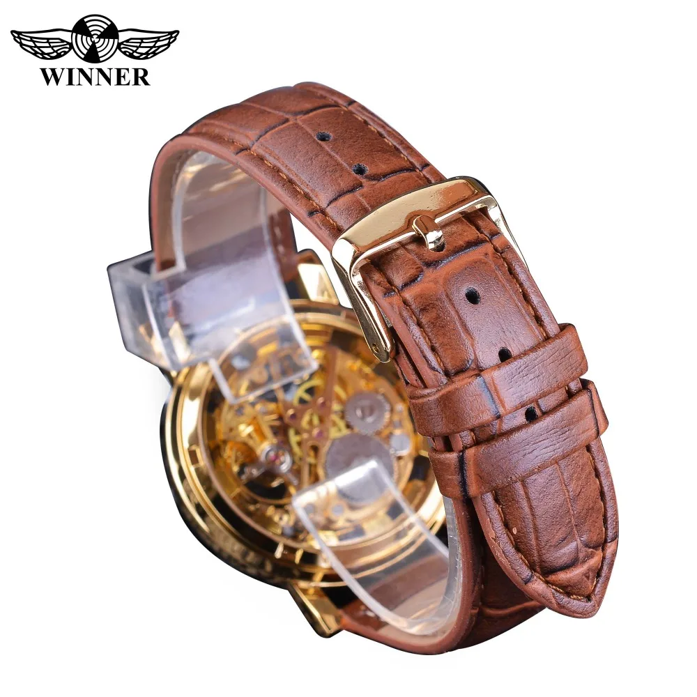 . (Zniżka 44%) Skup Tanie Zwycięzca przezroczysta złota koperta luksusowy casualowy wzór brązowy skórzany pasek męskie zegarki Top marka luksusowy zegarek mechaniczny szkielet Cena.
