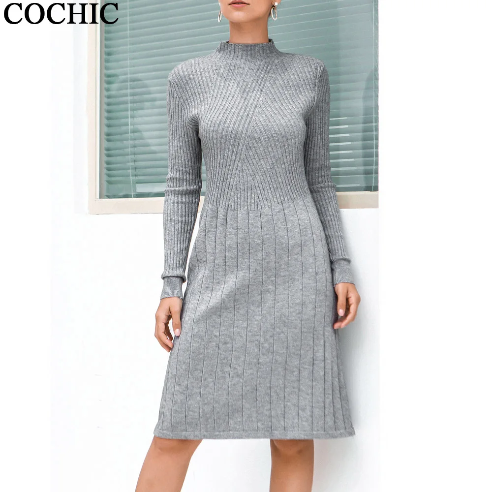 . (Zniżka 48%) Tanie Jesienno zimowa wykańczająca ciepła dzianinowa sukienka jednokolorowa półgolf w połowie długości sukienki swetrowe sukienka dzianinowa Cena.