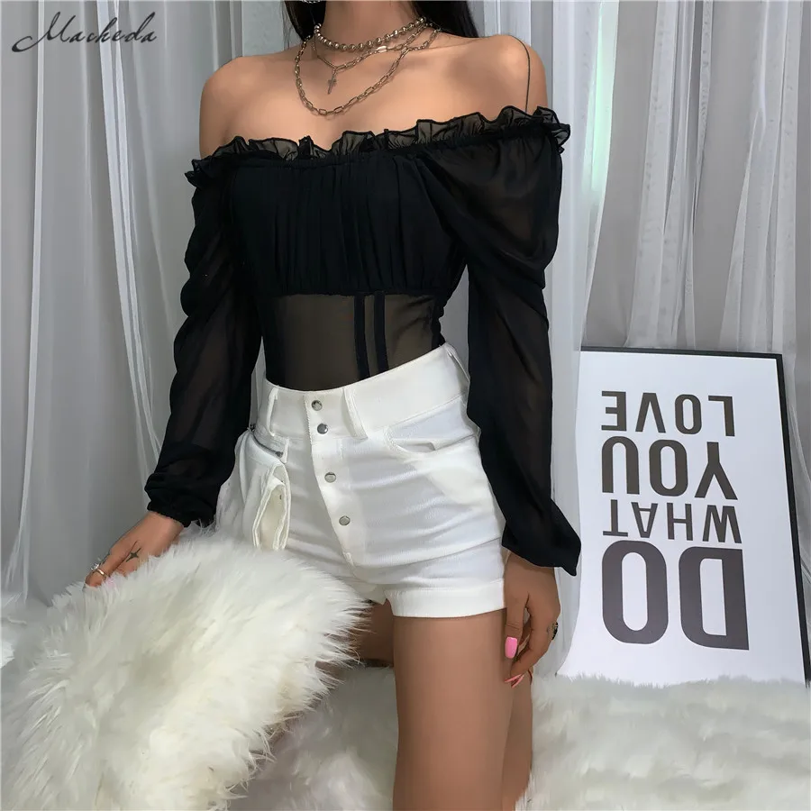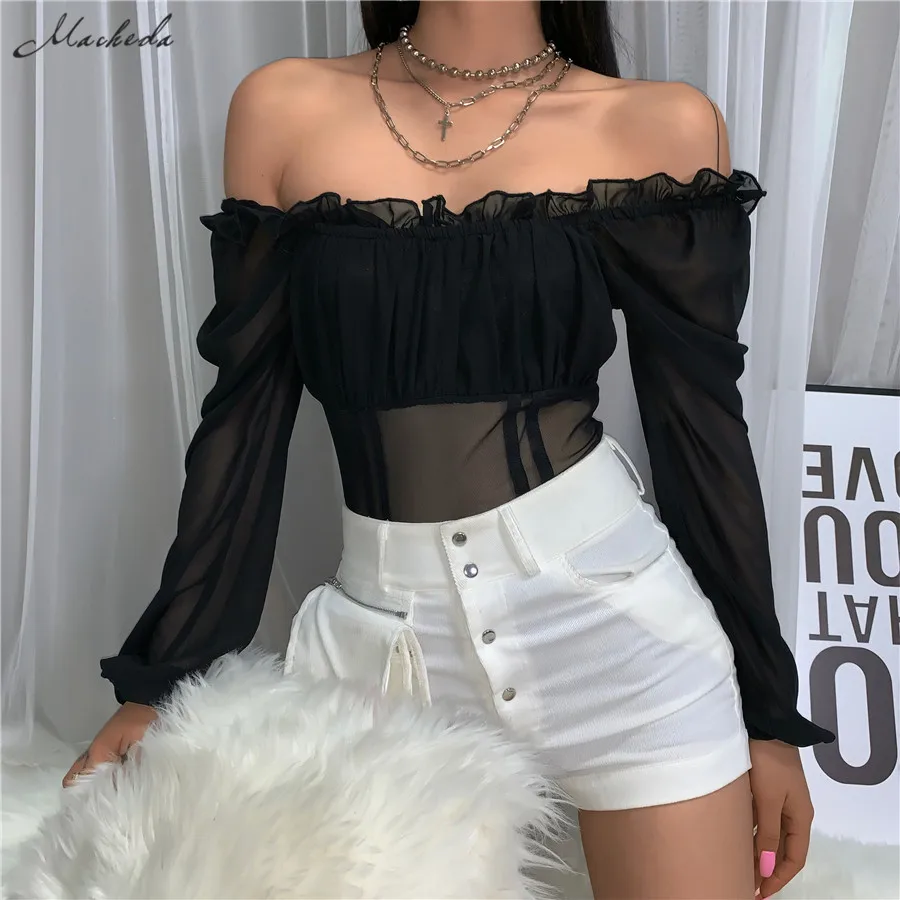 Special Offer Macheda czarny Sexy Mesh przezroczyste body kobiet jesień wzburzyć z długim rękawem nosić dzikie Slim elegancki Off Shoulder pajacyki 2019 Discount 50% Today!