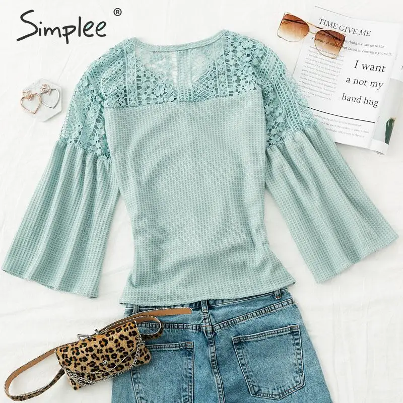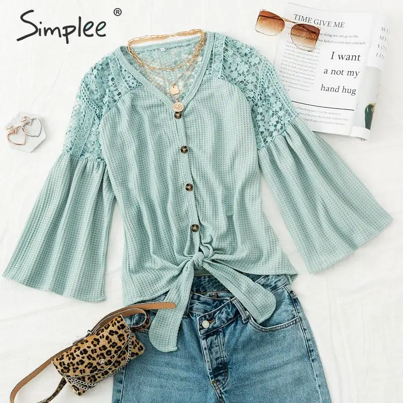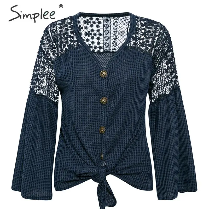 . (Zniżka 49%) Skup Tanie Simplee Sexy dekolt w kształcie litery v kobiety bluzka elegancka koronka haft hollow out luźna z długim rękawem biuro topy lace up jesień kobiet bluzka z krótkim rękawem Ceny.